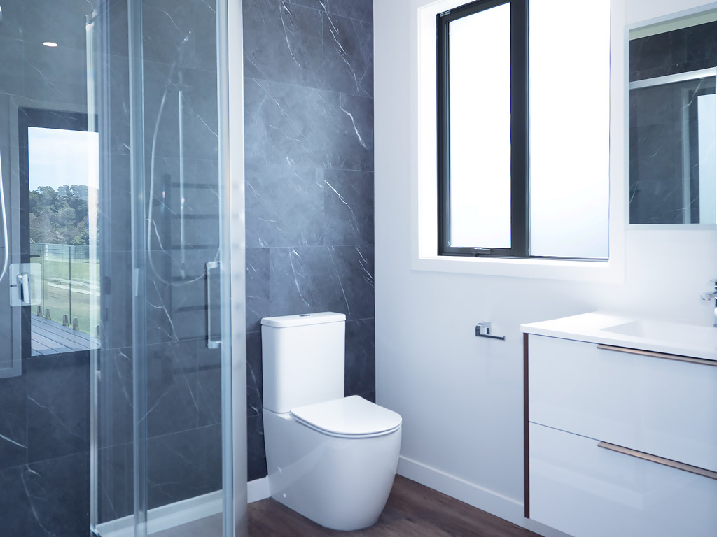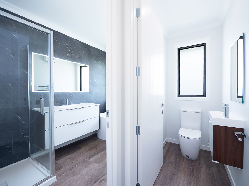 Bathrooms, Ensuites and WC have Korlok Vinyl Planking, floating above the floor is the wall mounted vanities and further above these are quality mirrors with LED lights and Demister functions. Where noted on plans there is a designer back to wall toilet suite that offers a soft closing lid and chrome toilet holder. Stylish Acrylic shower trays with glass shower screens are complimented by state of the art Dumawall Tiles from Belgium and mixers and tapware to suit.